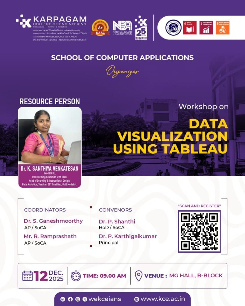 The School of Computer Applications , Karpagam College of Engineering, successfully organized a hands-on Workshop on “Data Visualization Using Tableau” on 12th December 2025 . The session was delivered by Dr. K. Santhiya Venkatesan, Head KGISL, Head of Learning & Instructional Design , who provided an engaging introduction to Tableau, demonstrated real-time data visualization techniques, and guided students in creating dashboards and analytical reports. Students gained valuable skills such as connecting datasets, building charts, applying filters and understanding the role of data visualization in analytics. The workshop received enthusiastic participation and excellent feedback from around 60 attendees from various colleges.