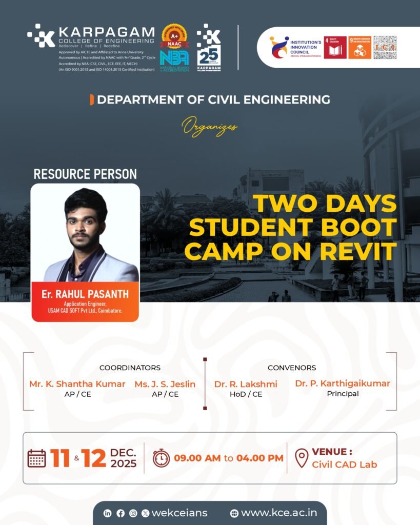 The Department of Civil Engineering organised a Two-Day Student Boot Camp on Revit on 11th and 12th December 2025 to enhance students’ skills in Building Information Modeling (BIM).