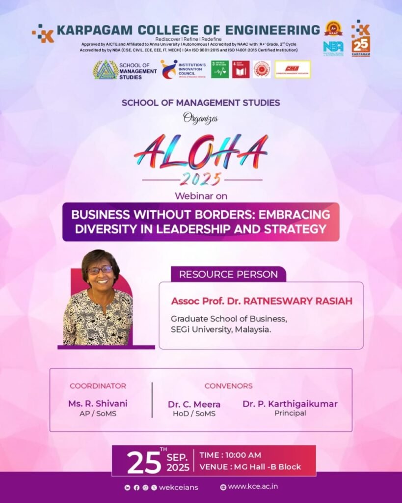 School of Management Studies, Karpagam College of Engineering, organized ALOHA 2025, a webinar on the theme “Business Without Borders: Embracing Diversity in Leadership and Strategy” on 25th September 2025. The event was designed to create awareness among management students about the growing significance of diversity and inclusion in leadership and the need to develop global strategies for success in a borderless business world.